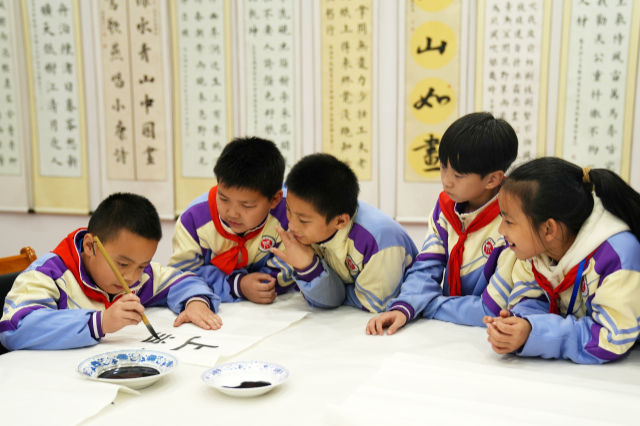 孩子們?cè)诶蠋煹闹笇?dǎo)下練習(xí)書(shū)法,感受傳統(tǒng)文化的魅力。通訊員 陳旗海 攝