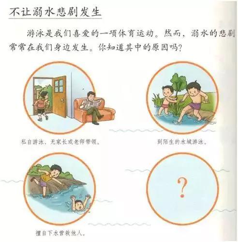 教科書通過列舉造成溺水的多種原因,引導(dǎo)學(xué)生思考如何避免溺水悲劇發(fā)生,并詳細(xì)介紹未成年人遭遇溺水危險時自救和輔助營救的正確做法,幫助孩子們樹立安全意識,預(yù)防意外事故的發(fā)生,有效化解危機(jī)。