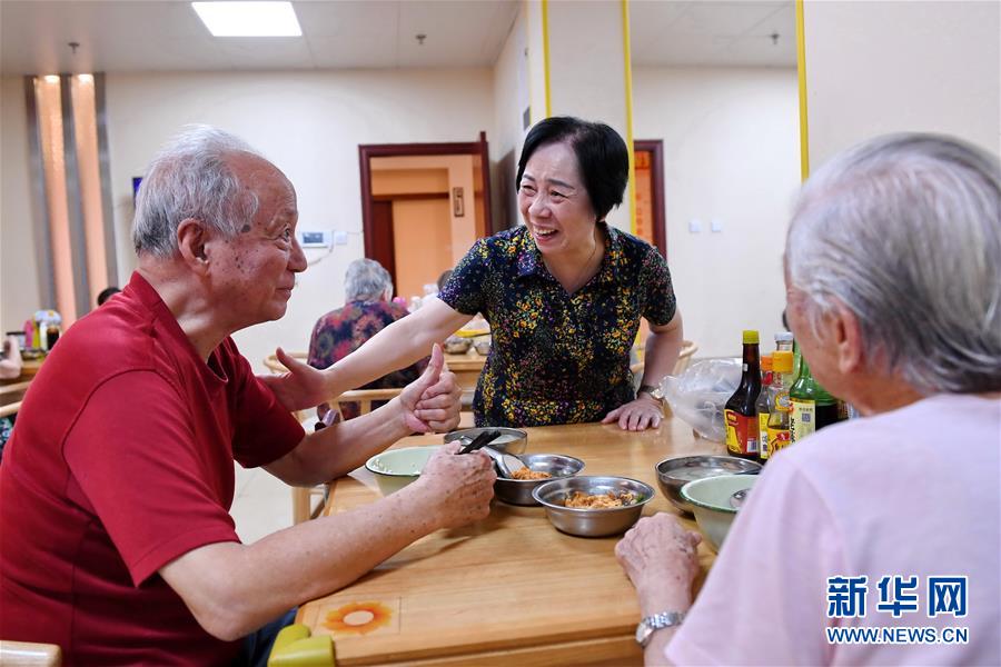 福州市鼓樓區(qū)東街街道軍門社區(qū)黨委書記林丹(中)在社區(qū)居家養(yǎng)老服務(wù)照料中心與就餐老人劉建國(左)和他的老伴打招呼(7月30日攝)。新華社記者 林善傳 攝