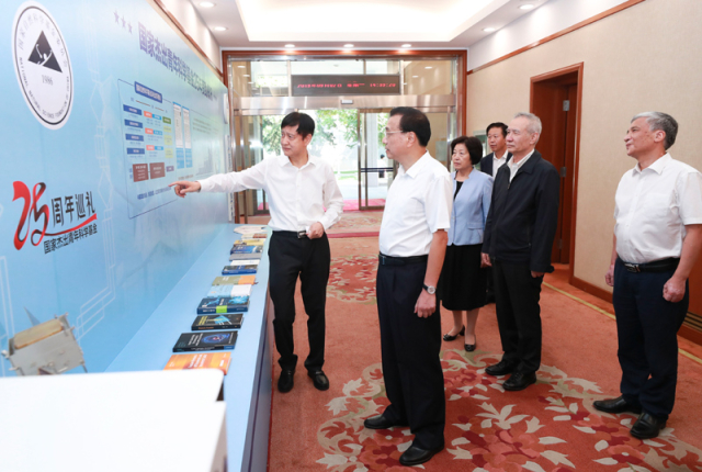 會前,在通往國務(wù)院第一會議室的走廊上,李克強和國務(wù)院其他幾位領(lǐng)導(dǎo)參觀了國家杰出青年科學(xué)基金25周年巡禮展。
