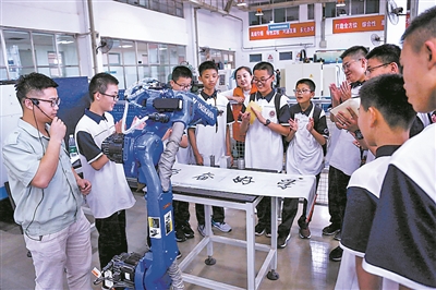 中小學(xué)生到山東勞動(dòng)職業(yè)技術(shù)學(xué)院參觀工業(yè)機(jī)器人實(shí)訓(xùn)基地。