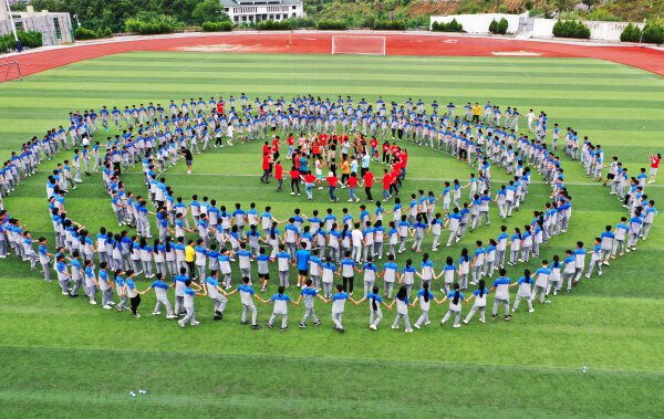 2021年6月2日,貴州省從江縣第二民族高級中學的高三學生在參加吹蘆笙踩歌堂減壓活動(無人機照片)。