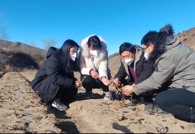 圍場縣銀里村黨支部書記孫國志(右二)和燕山大學(xué)駐村工作隊(duì)的同志,一起來到藥材種植戶高亞紅(左一)家的地頭,查看蒼術(shù)越冬情況,探討冬季蒼術(shù)種植養(yǎng)護(hù)小妙招。