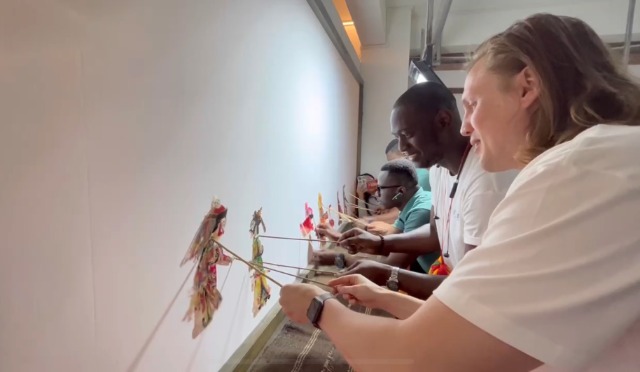 留學(xué)生現(xiàn)場體驗隴東道情皮影戲表演。王建蓉 攝