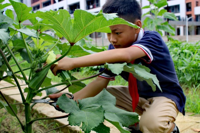學(xué)生正在采摘蔬菜。學(xué)校供圖