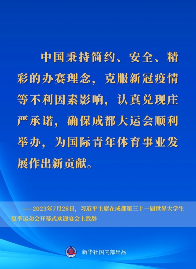 7月28日中午,國家主席習近平和夫人彭麗媛在四川省成都市金牛賓館舉行宴會,歡迎出席成都第三十一屆世界大學生夏季運動會開幕式的國際貴賓。一起來看習近平主席在歡迎宴會上的致辭要點。