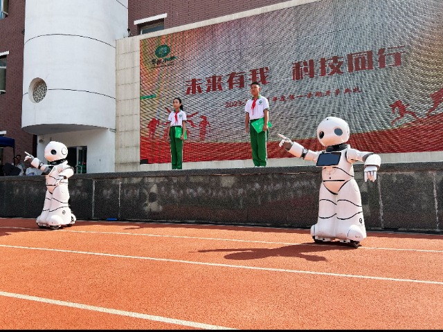 “新學(xué)期好!新學(xué)期新面貌!”“小翠”和“小微”分列紅毯兩側(cè),向同學(xué)們一邊揮手一邊問(wèn)好,引得不少同學(xué)駐足觀看。開(kāi)學(xué)典禮上,兩位機(jī)器人還伴隨音樂(lè)表演科技感十足的舞步,拉起氣氛高潮。