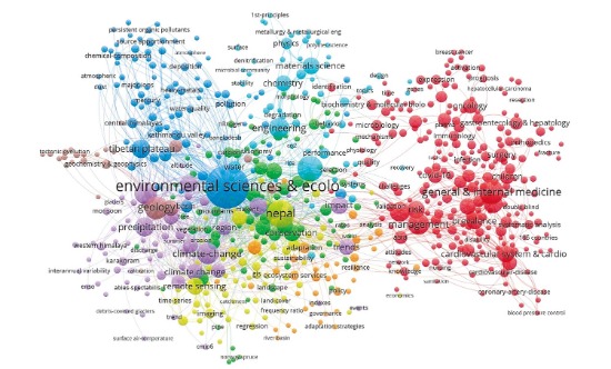 不斷取得“一帶一路”科技成果。我國(guó)與共建國(guó)家的科研合作逐漸加強(qiáng),在論文合作方面表現(xiàn)較為明顯。論文合作數(shù)量由2014年的8707篇,增長(zhǎng)至2021年的28744篇,同比增長(zhǎng)230.13%。合作研究領(lǐng)域重點(diǎn)聚焦在材料科學(xué)、工程電氣電子、應(yīng)用物理、環(huán)境科學(xué)和化學(xué)物理5大領(lǐng)域。以其中與我國(guó)合作密切的尼泊爾為例,尼泊爾地理位置獨(dú)特,擁有豐富的自然資源和生態(tài)系統(tǒng),同時(shí)也面臨著環(huán)境污染、生態(tài)安全、衛(wèi)生健康等方面的挑戰(zhàn),因此我國(guó)與尼泊爾在環(huán)境保護(hù)、氣候變化和衛(wèi)生醫(yī)療領(lǐng)域有著密切的交流與合作(如圖1)。我國(guó)的中國(guó)科學(xué)院青藏高原研究所和西藏大學(xué)與尼泊爾的特里布文大學(xué)和尼泊爾科學(xué)院等有著廣泛的科技合作與交流。未來(lái),中國(guó)與尼泊爾在醫(yī)療技術(shù)交流、醫(yī)學(xué)研究合作、人員培訓(xùn)和醫(yī)療設(shè)施建設(shè)等方面有著廣闊的合作空間,在公共衛(wèi)生、疾病預(yù)防控制、傳染病治療和健康管理等領(lǐng)域可以互相分享經(jīng)驗(yàn)和資源,共同應(yīng)對(duì)醫(yī)療挑戰(zhàn)。2022年,中尼外長(zhǎng)在會(huì)談中一致表示,將構(gòu)建跨喜馬拉雅立體互聯(lián)互通網(wǎng)絡(luò)。西藏與尼泊爾在科技合作領(lǐng)域?qū)⒕哂懈訌V闊的合作空間。