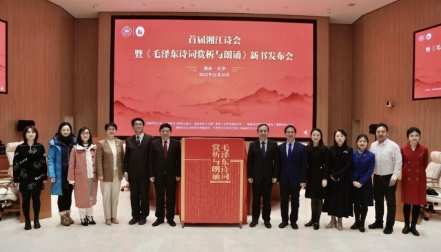 12月20日,首屆湘江詩會(huì)暨《毛澤東詩詞賞析與朗誦》新書發(fā)布會(huì)在湖南師范大學(xué)舉行。中國語文現(xiàn)代化學(xué)會(huì)會(huì)長、中國傳媒大學(xué)博士生導(dǎo)師、《毛澤東詩詞賞析與朗誦》作者姚喜雙,湖南師范大學(xué)黨委委員、副校長唐賢清,北京外國語大學(xué)黨委常委、副校長賈德忠,外研社黨委副書記、副董事長、總編輯、國家語言文字推廣基地(北京外國語大學(xué))主任劉捷共同為《毛澤東詩詞賞析與朗誦》揭幕。