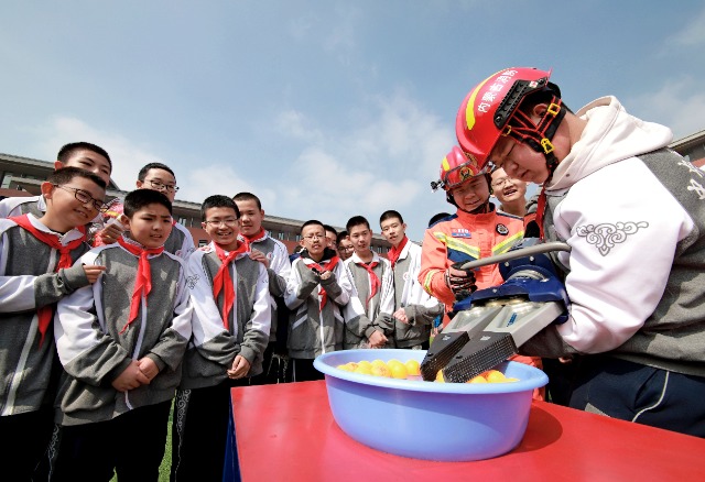 演練現(xiàn)場,中央民大附屬中學(xué)呼和浩特分校的學(xué)生體驗(yàn)液壓剪擴(kuò)鉗。陳先達(dá) 攝