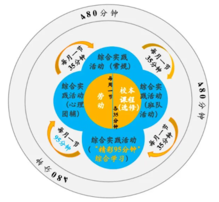 依照《辦法》,學(xué)校以月為單位,將勞動(dòng)、綜合實(shí)踐活動(dòng)(含班隊(duì)活動(dòng))、地方課程和校本課程等占比14%-18%的課時(shí)進(jìn)行統(tǒng)籌安排,打通使用,打造綜合學(xué)習(xí)的“精彩95分鐘”模塊,保障全體學(xué)生六年經(jīng)歷60次深度綜合學(xué)習(xí)。