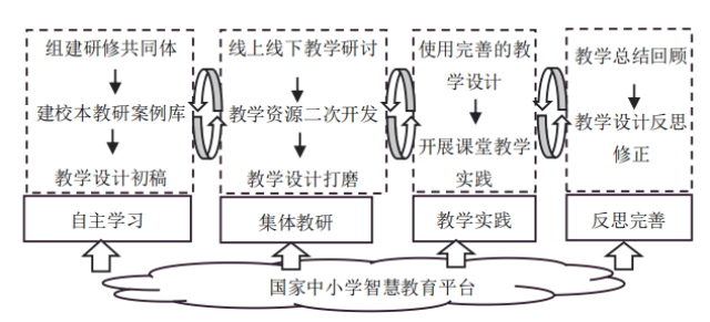 平臺支持的校本研修應用包含自主學習、集體教研、教學實踐、反思完善四個主要環(huán)節(jié)。以學科組為單位組建的校本研修共同體,根據(jù)教學實際需求分析平臺資源,搭建校本教研案例庫,組織教師自主學習。在自主學習與形成初步教學設計方案的基礎上,共同體進行線上線下集體研討,形成研磨后的集體教學設計方案。教師根據(jù)集體形成的教學方案進行個性化完善,開展教學實驗,進行教學反思,校本研修活動發(fā)揮了全過程、可視化的研修評價功能,有針對性地解決日常教學中出現(xiàn)的問題。