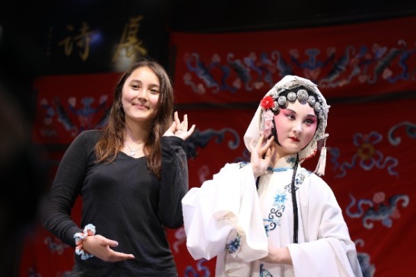 這里的建筑灰墻黛瓦,飛檐翹角,高閣林立,處處透露著中國傳統(tǒng)建筑式樣的獨特文化韻味,而國粹京劇的現(xiàn)場表演更讓美國師生流連忘返。只見來自保定藝術(shù)學(xué)校的學(xué)生們身著鮮艷的戲曲服裝,猶如一群從古代穿越而來的使者,帶來了一場別開生面的中國優(yōu)秀傳統(tǒng)戲曲文化藝術(shù)展示,那婉轉(zhuǎn)的唱腔、靈動的眼神、優(yōu)美的身段,瞬間吸引了所有人的目光。這獨具東方魅力的戲曲文化讓美國青少年瞪大了眼睛,臉上寫滿了驚奇和贊嘆,不時發(fā)出熱烈的掌聲。