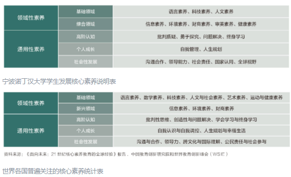 為踐行大思政理念,達(dá)成中外育人共識,寧諾吸收了當(dāng)前世界各國對核心素養(yǎng)的研究成果,在表1所列的核心素養(yǎng)基礎(chǔ)上,結(jié)合我國發(fā)布的《中國學(xué)生發(fā)展核心素養(yǎng)》以及“寧波諾丁漢大學(xué)2020戰(zhàn)略規(guī)劃”(外方主導(dǎo)制定),構(gòu)建了“寧波諾丁漢大學(xué)學(xué)生發(fā)展核心素養(yǎng)”體系(見表2)。