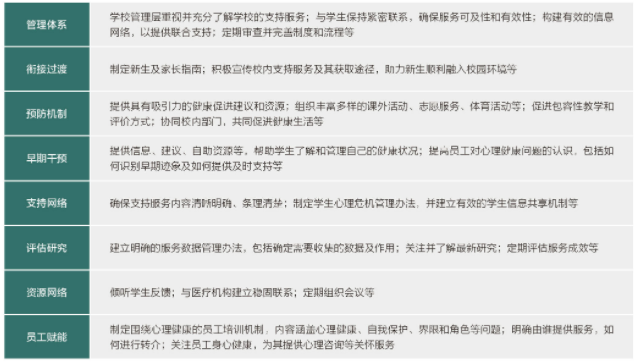 寧諾制定了《學生心理健康教育戰(zhàn)略方針》(見表),從管理體系、銜接過渡、預(yù)防機制、早期干預(yù)、支持網(wǎng)絡(luò)、評估研究、資源網(wǎng)絡(luò)及員工賦能八大板塊詳細規(guī)劃了目標與措施。