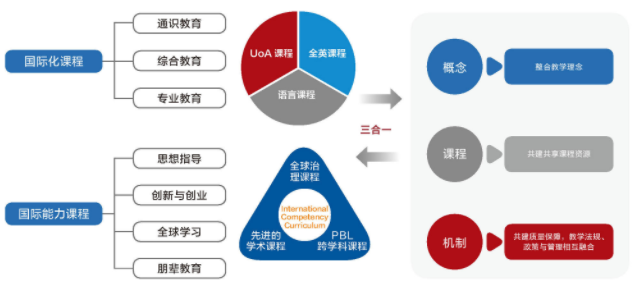 優(yōu)課程,切實(shí)提高新工科人才培養(yǎng)過程質(zhì)量。一流創(chuàng)新人才培養(yǎng)是高校的根本任務(wù)和使命。中外合作辦學(xué)在人才培養(yǎng)上具有開拓國際視野和創(chuàng)新能力的優(yōu)勢(shì)。在人才培養(yǎng)方案中,通過課程體系的國際融合和科學(xué)設(shè)置,將為一流創(chuàng)新人才的培養(yǎng)開辟有效路徑。學(xué)院讓中英雙方共同設(shè)計(jì)課程和培養(yǎng)方案,課程設(shè)計(jì)滿足四個(gè)“三分之一”原則,每個(gè)專業(yè)超過50%的學(xué)科基礎(chǔ)課和專業(yè)課由阿伯丁大學(xué)承擔(dān)。在課程體系設(shè)置上,結(jié)合國內(nèi)人才培養(yǎng)體系中需涵蓋的通識(shí)課程、學(xué)科大學(xué)課程和專業(yè)課程,構(gòu)建了一套融合概念、課程和機(jī)制的國際化課程體系(如圖)。