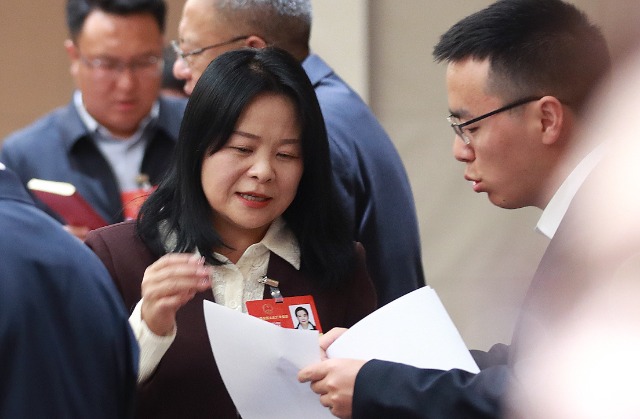 3月9日,全國(guó)人大代表、云南省曲靖市第二小學(xué)校長(zhǎng)李青霖(左)與小組工作人員交流。