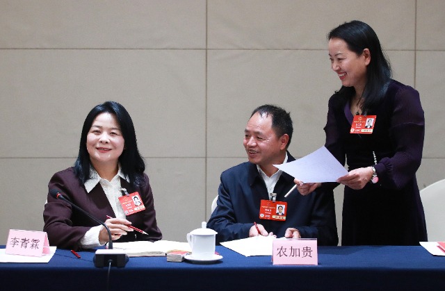 3月9日,李青霖(左)農(nóng)加貴(中)、甄蘭芳3位代表在一起討論交流。