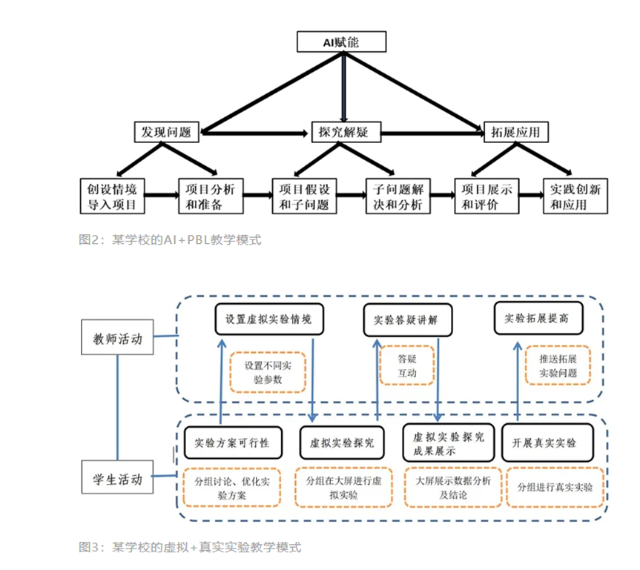 在這方面,我國(guó)一些學(xué)校已經(jīng)先行先試,積累了許多經(jīng)驗(yàn)。首先,要根據(jù)學(xué)情組織完成人工智能教育課程體系設(shè)計(jì),遵循“感知—應(yīng)用—?jiǎng)?chuàng)造”等學(xué)生發(fā)展特點(diǎn)和路徑。其次,要構(gòu)建以人工智能為輔助手段的教學(xué)模式。比如某學(xué)校通過人工智能賦能PBL教學(xué)模式(見圖2),利用人工智能工具進(jìn)行實(shí)時(shí)反饋、課后提供個(gè)性化學(xué)習(xí)建議等,找尋教學(xué)創(chuàng)新路徑,激發(fā)學(xué)生的內(nèi)驅(qū)力和創(chuàng)新精神,提高教學(xué)效率和質(zhì)量。又如,某學(xué)校探究虛擬+真實(shí)實(shí)驗(yàn)的教學(xué)模式(見圖3)。在理科實(shí)驗(yàn)探究課中,教師在開始實(shí)驗(yàn)操作前,根據(jù)課標(biāo)要求在虛擬實(shí)驗(yàn)情境中與學(xué)生一起討論實(shí)驗(yàn)的可行性和需要的實(shí)驗(yàn)參數(shù),并通過對(duì)虛擬實(shí)驗(yàn)所得數(shù)據(jù)進(jìn)行分析獲得結(jié)論。在此基礎(chǔ)上,學(xué)生分組進(jìn)行真實(shí)實(shí)驗(yàn)。最后,要建立學(xué)生人工智能能力測(cè)評(píng)體系。以計(jì)算思維為例,計(jì)算思維能力是人工智能學(xué)習(xí)的重要內(nèi)容,[10] 有學(xué)校從問題拆分、問題評(píng)估、模型提煉、邏輯推理、總結(jié)歸納5個(gè)維度評(píng)估學(xué)生的計(jì)算思維,不僅關(guān)注學(xué)生對(duì)人工智能基本概念與原理的熟悉程度,還重視其在實(shí)際問題解決中展現(xiàn)出的邏輯思維、創(chuàng)新能力和團(tuán)隊(duì)協(xié)作能力,以此更加有效地評(píng)估課程實(shí)施的效果。通過定期測(cè)評(píng)和反饋機(jī)制,學(xué)校能夠及時(shí)了解學(xué)生的學(xué)習(xí)情況,為個(gè)性化教學(xué)提供有力支持。