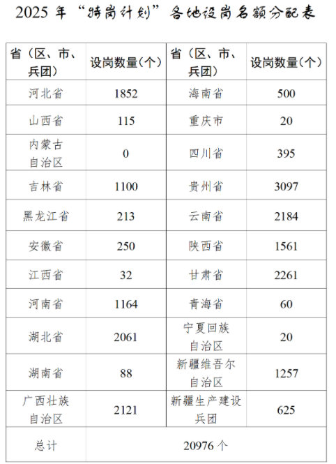 2025年“特崗計劃”各地設(shè)崗名額分配表