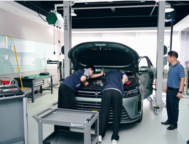 在問(wèn)界汽車培訓(xùn)中心,學(xué)生正在對(duì)車輛進(jìn)行檢修實(shí)訓(xùn)。