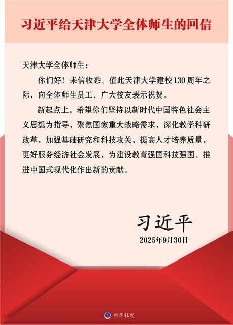 近日,中共中央總書記、國(guó)家主席、中央軍委主席習(xí)近平給天津大學(xué)全體師生回信,在天津大學(xué)建校130周年之際,向全體師生員工、廣大校友表示祝賀。