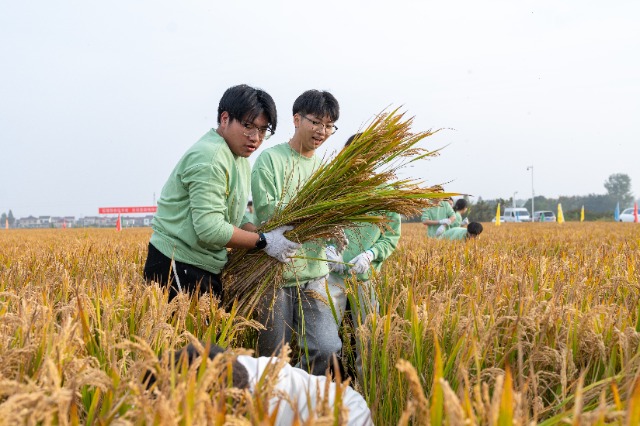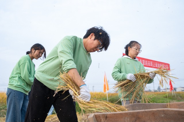 54名青年學子組成9支隊伍,在金色的稻田里展開了一場激烈的水稻收割比拼。比賽分為“收割”和“脫粒”兩個環(huán)節(jié),既考驗隊員們使用傳統(tǒng)農(nóng)具的熟練程度和團隊協(xié)作的默契度,也檢驗他們對“顆粒歸倉”這一勞動品質的理解與踐行。經(jīng)過緊張激烈的角逐,“稻滿爭先”隊憑借“零割漏,快準狠”的精湛技藝脫穎而出,勇奪冠軍。