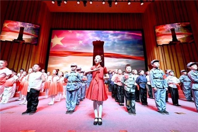 “我的家在東北松花江上……”小學(xué)部孩子們演繹的情景劇《松花江上》,以王二小、小蘿卜頭等英雄故事為脈絡(luò),讓抗戰(zhàn)歷史與家國情懷在稚嫩歌聲中交融;初中部《轉(zhuǎn)身向光》則聚焦一名“問題學(xué)生”的蛻變,通過人文素養(yǎng)課程的引導(dǎo),這名學(xué)生從遲到懈怠到自律擔(dān)當(dāng),映射出教育對(duì)靈魂的喚醒;高中部大合唱《舟中曉望》更令人耳目一新——孟浩然的詩作與現(xiàn)代音樂碰撞,用和聲“繪”出云海初陽,讓古文在青春旋律中煥發(fā)新生。