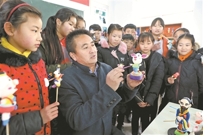 圖為在學?!胺沁z進課堂”活動中,王利在向?qū)W生傳授面塑技藝。