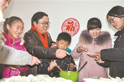 1月30日,在江蘇省盱眙縣仇集初級中學(xué)“留守兒童之家”活動室,“山媽”丁德芳(右二)、“山爸”吳凱(左二)和留守娃包餃子提前過年。該校位于蘇皖交界山區(qū),近三分之一學(xué)生是留守兒童。近年來,該校教師以夫妻為組合,當(dāng)起了“山媽山爸”,呵護(hù)這些孩子成長。