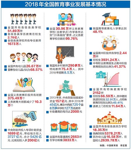 根據(jù)2018年全國(guó)教育事業(yè)統(tǒng)計(jì),全國(guó)共有各級(jí)各類學(xué)校51.89萬(wàn)所,各級(jí)各類學(xué)歷教育在校生2.76億人,各級(jí)各類學(xué)校共有專任教師1673萬(wàn)人,各級(jí)各類教育普及水平不斷提高,國(guó)民受教育機(jī)會(huì)進(jìn)一步擴(kuò)大。其中,普惠性幼兒園占比達(dá)68.57%;大班額、超大班額實(shí)現(xiàn)10年來(lái)最大降幅;全國(guó)99.76%的義務(wù)教育學(xué)校辦學(xué)條件達(dá)到“20條底線”要求;全國(guó)28個(gè)省份吸引33.5萬(wàn)名高校畢業(yè)生到鄉(xiāng)村任教,其中2018年達(dá)4.5萬(wàn)人;高等教育毛入學(xué)率達(dá)48.1%,已建成世界上規(guī)模最大的高等教育體系。