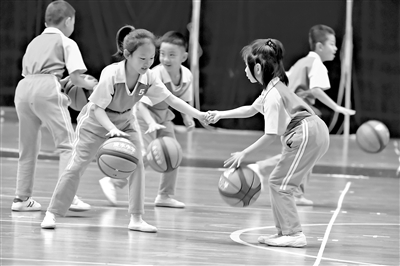 胡甘霖在示范課中設(shè)計了4個游戲,抱團游戲中,胡甘霖通過喊數(shù)、打手勢、加減法運算三種形式讓學生參與游戲。胡甘霖告訴記者,喊數(shù)抱團是讓學生集中注意力,打手勢意在讓學生在運球中不光要看球還要注意抬頭觀察,加減法運算則是不僅要抬頭觀察還要學會思考。