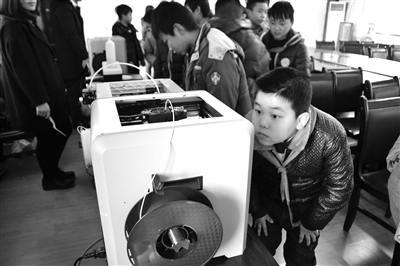 左圖為創(chuàng)客教室里的3D打印機(jī)吸引孩子的注意。