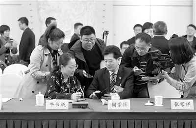 3月6日,十三屆全國人大二次會議河南省代表團舉行全體會議,審議政府工作報告。會后,記者圍住代表爭相采訪。本報記者 張學軍 攝