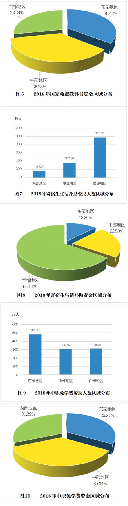 2018年,全國共有1499.58萬家庭經(jīng)濟(jì)困難寄宿生享受生活費(fèi)補(bǔ)助政策。其中,西部地區(qū)973.58萬人、中部地區(qū)357.70萬人、東部地區(qū)168.30萬人。(見圖7)