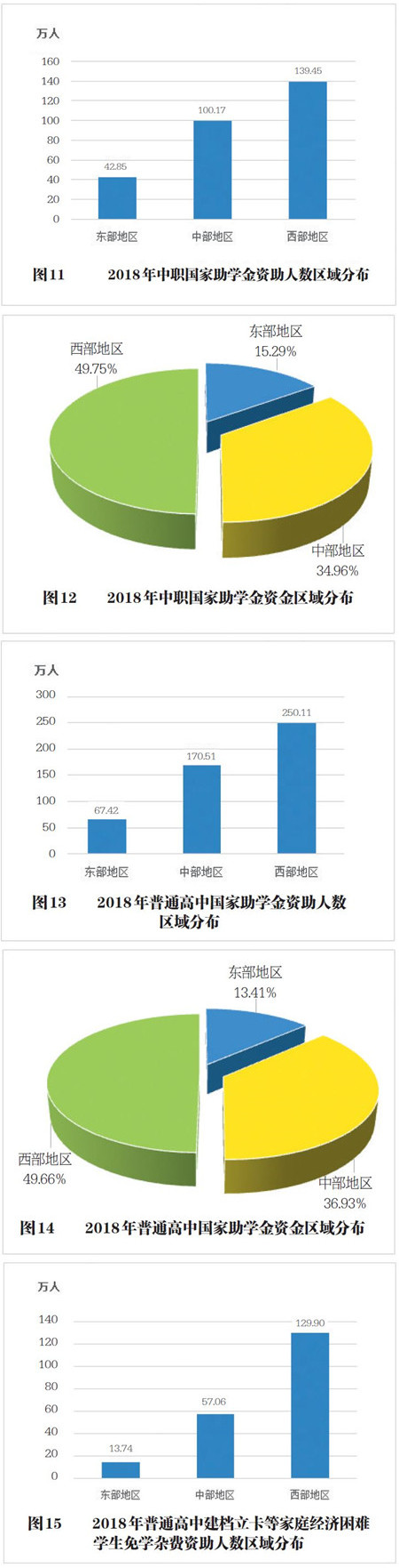 從區(qū)域來看,西部地區(qū)國家助學(xué)金資金27.95億元,占49.75%;中部地區(qū)19.64億元,占34.96%;東部地區(qū)8.59億元,占15.29%。(見圖12)