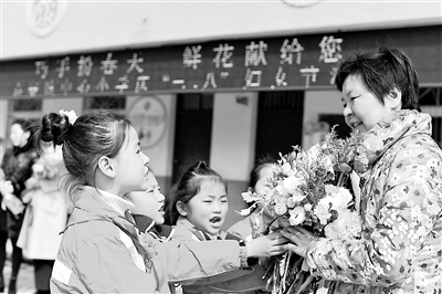 在“三八”國際婦女節(jié)來臨之際,安徽省阜陽市潁東區(qū)袁寨鎮(zhèn)中心小學舉行“巧手扮春天,鮮花獻給您”現場插花活動。該校的30位女教師興趣盎然、邊看邊學,享受著創(chuàng)作的樂趣和插花藝術的快樂。圖為身著校服的少先隊員將現場制作的插花作品獻給可親可敬的女老師。