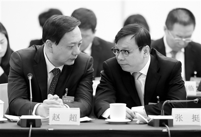 3月12日,十三屆全國人大二次會(huì)議陜西代表團(tuán)全體會(huì)議審議外商投資法草案修改稿、最高人民法院工作報(bào)告、最高人民檢察院工作報(bào)告。圖為全國人大代表、陜西國際商貿(mào)學(xué)院董事長兼院長趙超(左)與其他代表交流。本報(bào)記者 張學(xué)軍 攝