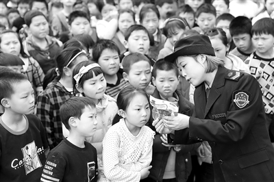 3月11日,四川省廣安市市場監(jiān)督管理局的執(zhí)法人員在華鎣市陽和鎮(zhèn)雙碑村小傳授假冒偽劣食品識別技巧。近日,該單位組織執(zhí)法人員不留死角地分別深入轄區(qū)各村小,開展食品安全知識宣傳和檢查,確保學(xué)生食品安全。邱海鷹 唐仕元 攝