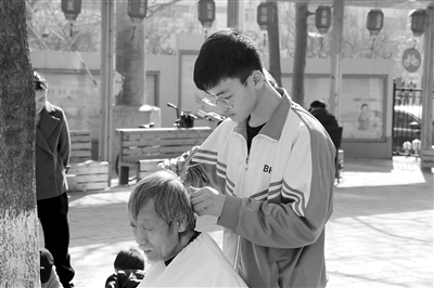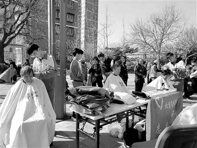 圖為該校以美容美發(fā)專業(yè)學(xué)生為主的志愿者們?yōu)樯鐓^(qū)居民義務(wù)理發(fā)。通訊員 楊洋 高逸飛 攝影報(bào)道