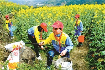 3月16日,江西省婺源縣溪頭鄉(xiāng)龍尾小學(xué)學(xué)生在收撿垃圾。正值婺源縣油菜花開旺季,前來(lái)賞花踏春的游客絡(luò)繹不絕。該校五年級(jí)學(xué)生利用雙休日時(shí)間,來(lái)到江嶺萬(wàn)畝油菜花海,收撿游客留下的生活垃圾,倡導(dǎo)綠色環(huán)保、文明出游。卓忠偉 汪海蛟 攝