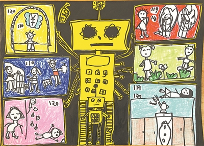 左邊第一幅:“如果我看到有人站在樓頂,比較危險(xiǎn),我就讓千里眼機(jī)器人打電話給警察叔叔,讓他們準(zhǔn)備很大很厚的充氣床墊過(guò)來(lái),以防樓上的人掉下來(lái)?!?/P>