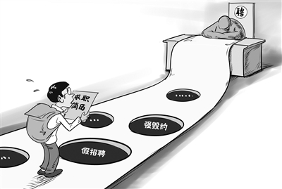 又到一年校招季,《中國青年報》記者近日在江西、廣東等地調查了解到,部分高校畢業(yè)生在找工作面試過程中遇到一些“奇葩”現(xiàn)象。2018年9月,江西財經(jīng)大學應屆畢業(yè)生徐震宇找好工作并簽訂三方協(xié)議。面試時說得清清楚楚是運營崗,但公司后來以“能力不足”為由把他調到銷售崗。一打聽,招進去的畢業(yè)生都調了崗,因為企業(yè)招聘銷售崗難,所以在招聘時用了“先引入門、再騙進坑”的手段。
