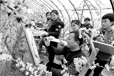 近日,安徽省阜陽(yáng)市潁東區(qū)正午鎮(zhèn)陳寨小學(xué)美術(shù)教師在桃花盛開的大棚內(nèi)指導(dǎo)小學(xué)生畫桃花。日前,該校開展“尋找春天、繪畫美麗”主題活動(dòng),利用地域資源,小學(xué)生在美術(shù)教師的帶領(lǐng)下,走進(jìn)大自然,描繪心中美麗的春天。