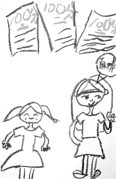 這是一個8歲女生畫的畫,名為“我最開心的事”。畫面中,一個扎著馬尾辮的女孩舞動雙手,臉上露出燦爛的微笑。小女孩右邊是她的媽媽,媽媽舉起大拇指說“真棒”。女孩和媽媽的頭上飄著幾張寫著100分的試卷。這個小女孩告訴我,自己最開心的事是考了“雙百分”,得到了媽媽的表揚。可惜她只在一年級考過100分,后來就再也沒有考過了。從此以后,媽媽也沒有再表揚過她了。這個女孩用繪畫表達的是:自己最渴望得到的是父母的認可。
