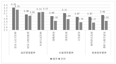 農(nóng)村園長對(duì)專業(yè)素養(yǎng)的自我評(píng)價(jià)普遍低于城市園長。除了在組織管理素養(yǎng)、財(cái)務(wù)與物資配置以及外部關(guān)系管理素養(yǎng)外,農(nóng)村園長在其他維度上均顯著低于城市園長。