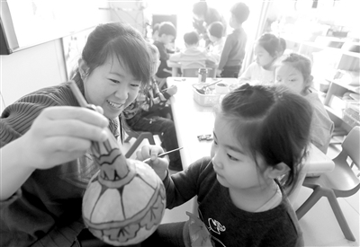 河北省張家口市宣化區(qū)趙川幼兒園從2016年開始進行課程改革,經(jīng)過三年多的探索、研究,改變了以“教師為中心”的慣性思維和注重知識傳授的傾向,如今自主游戲已經(jīng)成為該園的基本活動形式。圖為教師在配合孩子完成葫蘆繪畫作品。宋強 張學軍 攝