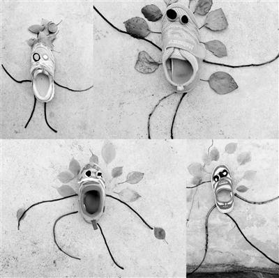 在一次翻閱雜志時,我偶然看到有藝術(shù)家拿鞋子做文章。在鞋子上畫滿色彩斑斕的圖案,一只只普通的鞋子一下子變成了有深度、有內(nèi)涵、有收藏價值的藝術(shù)品。如果把鞋子引進(jìn)“落葉活動”中,會怎么樣呢?