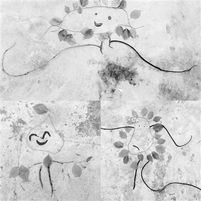孩子們在大樹下?lián)鞓渲?,在寬敞的水泥地上擺出了一個個“跳舞的人”,樹葉裝點(diǎn)成五官,小人變得飽滿、形象、有精神。
