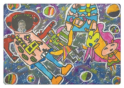 “我畫的是宇宙被地球統(tǒng)治以后,人類和所有外星人成了朋友,大家經(jīng)常約著到太空游玩。一個(gè)周末,我和我的外星朋友們約好一起去太空游樂場(chǎng)玩。我穿著我喜歡的長(zhǎng)頸鹿宇航服,坐著宇宙飛船到了太空,外星朋友們也來了。有哈丁星球長(zhǎng)著綠色臉蛋的丁丁,有來自汪汪星球的多多,還有來自喵喵星球的咪咪。在我身邊的,是一個(gè)大型滑梯,我從宇宙飛船里走出來就可以直接爬上滑梯的階梯。外星朋友們,也跟著一起開心地玩起來了。另外,我們周圍每一顆小行星上都有一個(gè)好玩的玩具。玩過滑梯后,我們還打算到別的小行星上,體驗(yàn)更多有趣的游戲?!?/P>